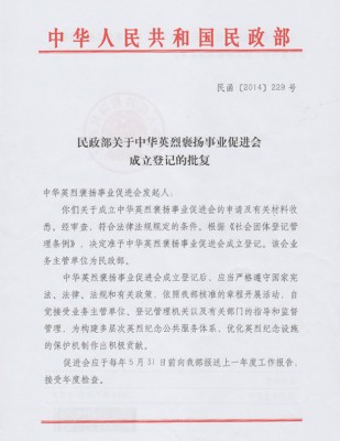 2014年7月22日,國務院批準成立中華英烈褒揚事業促進會。其根本宗旨是:“傳承英烈志,凝聚民族魂,共圓中國夢”。中華英烈褒揚事業促進會是由軍內外多名老將軍、老領導和李大釗烈士陵園、濟南革命烈士陵園、抗美援朝烈士陵園、撫順市雷鋒紀念館等單位發起的,從2013年8月份開始籌組,同年12月31日,民政部黨組研究通過成立中華英烈褒揚事業促進會的議案。2014年1月1日籌備組進入北京市西城區景山西街48號甲辦公。5月29日,民政部向國務院上報關于成立中華英烈褒揚事業促進會的請示。6月11日,民政部辦公廳向外交部發函征求中華英烈褒揚事業促進會籌備成立登記意見。7月3日,國務委員王勇在民政部《關于中華英烈褒揚事業促進會籌備成立的請示》上批示:報請萬全同志批示。