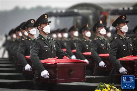 北京時間上午8時35分,中韓雙方在韓國仁川國際機場舉行志愿軍烈士遺骸交接儀式。上午11時05分,空軍專機雨中緩緩降落在遼寧沈陽桃仙國際機場。專機進入中國領空后,空軍兩架戰斗機護航,向志愿軍烈士致以崇高敬意,沈陽桃仙國際機場以“過水門”最高禮遇迎接志愿軍烈士回家。